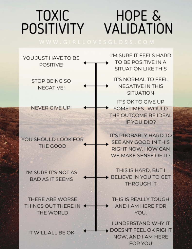 If you thought I was going to say, “You should just try to be more positive!” (in my brightest, most optimistic, rainbows and unicorns fairy voice). Sorry to disappoint, no. I love to discuss the power of positive thinking! It can be a life-changing and motivating force when utilized correctly. However, there is also something called “toxic positivity“. Sounds like an oxymoron, but it’s an actual term and you may be able to relate. This table is a great breakdown of what toxic positivity sounds like.